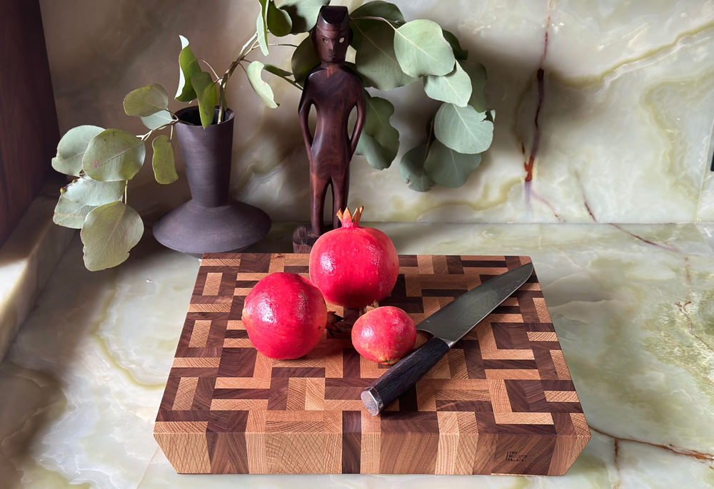 Cut. Chop. Slice and Serve on this beauty of a board for ever! Modern angled edges for ease of gripping and lifting. End grain construction prevents the majority of knife marks from showing on the board. The wood fibers self heal after chopping . End grain keeps your knives sharper and your cutting surface looking less marred.